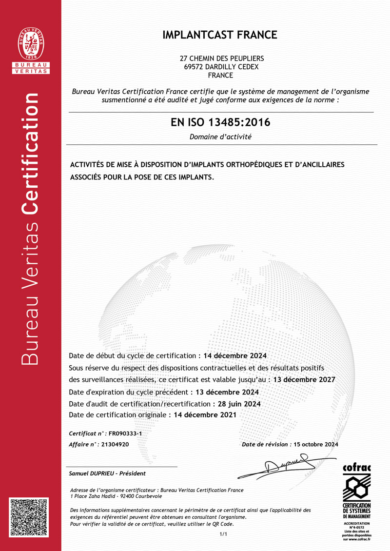 En engageant Implantcast France dans la mise en place et la gestion d’un système de management de la qualité selon le référentiel ISO 13485 et la réglementation applicable aux dispositifs médicaux, la société exprime sa volonté de satisfaire à l’ensemble des exigences applicables, de respecter les exigences des différentes parties intéressées et demande l’implication de chacun de ses collaborateurs dans une démarche d’amélioration continue de nos pratiques.