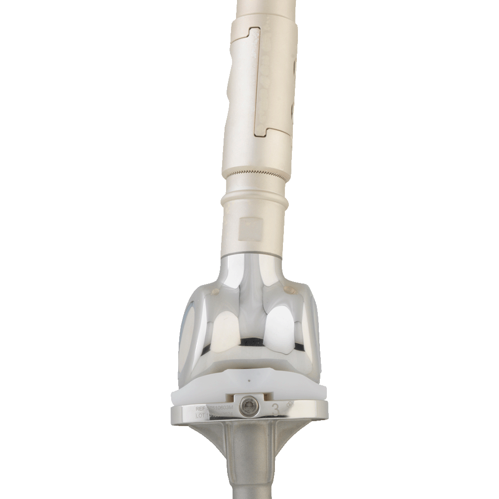 Sur le plan tibial, il s’associe à des embases et à des quilles cimentées ou sans ciment qu’il est possible de décaler au moyen d’offsets.